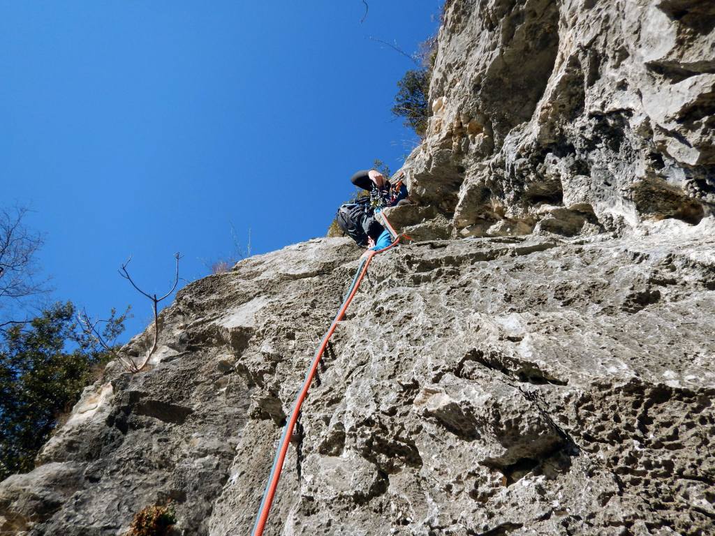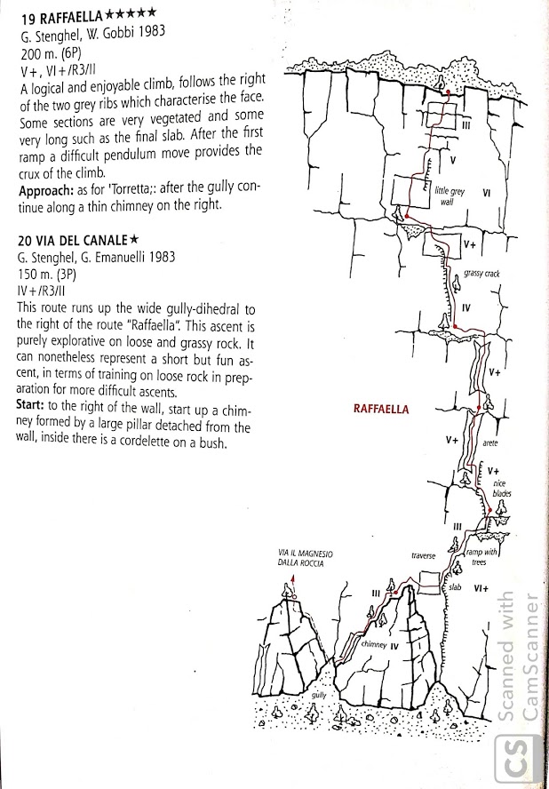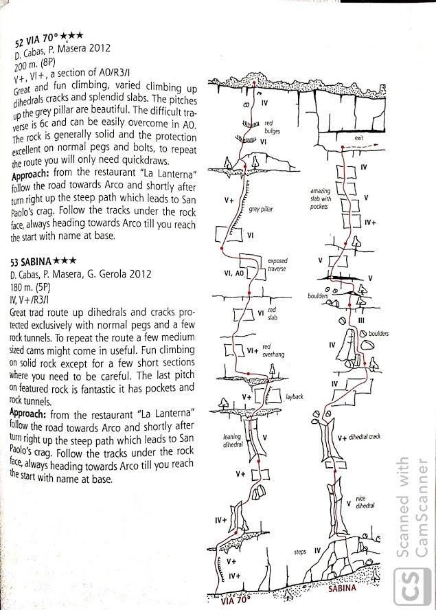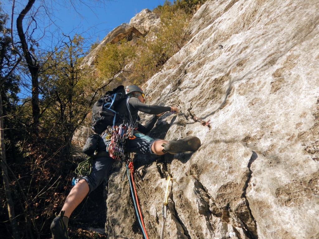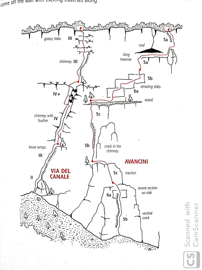 Для начала был выбран самый простой маршрут найденный в гайде — Via Canale. Но, оказалось не судьба — мы поздно вышли, долго искали подход под маршрут и, в результате начинать было уже поздно. Решили поехать на Parette Gandhi, посмотреть «чего дают» с расчетом пройти там другой маршрут на следующий день. Расположение Parette Gandhi настолько очевидно, а подход настолько короток, что даже у нас не возникло проблем с поиском. Мы пролезли пару первых пичтей на разных маршрутах, в очередной раз недоумевая, почему традовая IV+ выглядит как 6а+. После обеда заморосил дождь и мы ретировались. В последующие дни погода нас баловала и мы прошли 2 традовых маршруита на столь удачно расположенном Parette Gandhi: Argo и Sabina.